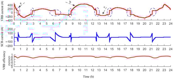 Compared with the conventional control strategy, under the control of the rule-based strategy proposed in this paper, the current flows of VRB and SCB over 24 h are shown in Figure 15, respectively. It can be seen that in the rule-based control strategy, the current becomes constant value (see marker “a” of Figure 15) and in order to maintain the current of VRB at a constant state, the SCB is discharged, which is corresponding to the “rule (2)”. As VRB is discharged by constant value “ΔI2” (shown in marker “a” of Figure 15), the SCB is charged, which indicates that “rule (3)” is running at this stage. As shown in marker “b” of Figure 15, if the current of VRB is higher than the threshold value “ΔI1”, the current of VRB remains the same as the current of the hybrid energy storage system (IHESS), and the SCB is in a standby state, which is corresponding to the “rule (1)”. When the VRB is in discharge state and the discharge current is less than the threshold value “ΔI2”, the current of VRB is equal to the current of the hybrid energy storage system (IHESS), as shown in marker “c” of Figure 15, and the SCB is still in a standby mode according to the “rule (4)”. Simulation results verify the effectiveness of the energy management strategy based on rules. Due to the constant current control near the zero-crossing point, the charging and discharging efficiency of VRB is significantly improved, which can be maintained in the range of 70–88% (shown in Figure 15). According to (17), the average efficiency of VRB reaches 80.01% over 24 h.
