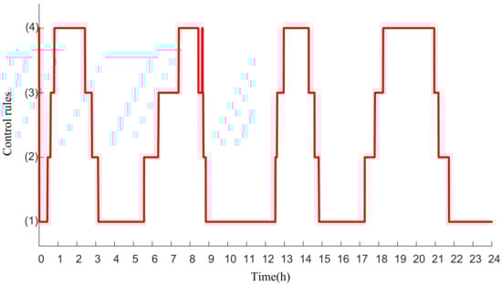 The operational state of the four control rules over 24 h is shown in Figure 17. It can be seen that “rule (1)” and “rule (4)” are running for a long time over 24 h, which validates SCB as an auxiliary power source because it is at a standby state for most of the time during the whole day.