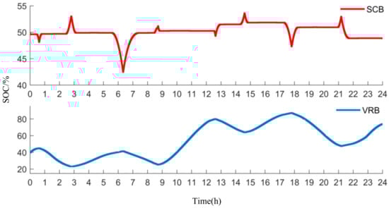 SOC of VRB and SCB over 24 h based on rule-based control strategy.