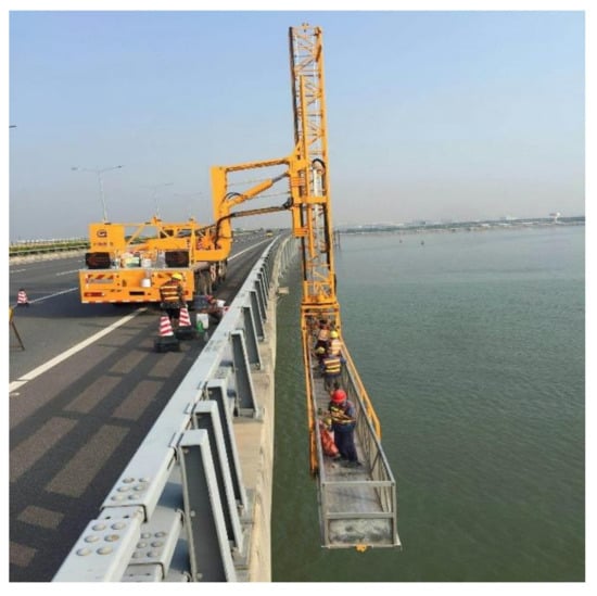 With increased investment in bridge construction, this is developing rapidly. Offshore bridges have become an important part of the bridge system. As an important means to connect various regions, they play an important role in the transportation system. After decades of development, many bridges built earlier have entered the maintenance stage. As one of the main bridge problems, cracks are the key goal of bridge detection and maintenance. Taking effective measures to detect bridge cracks will help to maintain traffic safety and normal operations [1]. The manual crack detection method is relatively simple, relying on manual observation to find cracks, but it is easy to miss the cracks, resulting in low detection efficiency. In the detection of large bridges, especially offshore bridges, the main working location is the high altitude outside the bridge, as shown in Figure 1, which greatly increases risks in detection work. Therefore, it is necessary to realize efficient and automatic bridge crack detection.