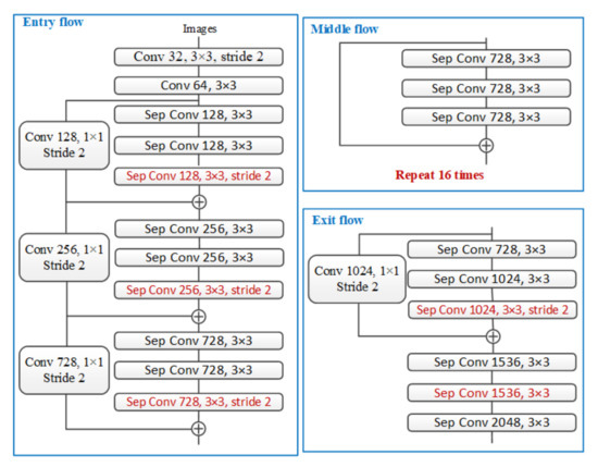 As can be seen from Figure 3, the optimization of the network structure is mainly reflected in the following aspects: (a) the middle flow in the original Xception structure is repeated more times, and the network structure is deepened; (b) the depth-wise separable convolution is used to replace the max pooling in the original network, so that the network can extract the feature maps at any resolution by using atrous separable convolution; (c) referring to the design of MobileNet, batch normalization and ReLU (Rectified Linear Unit) activation are added after each 3 × 3 depth-wise convolution.