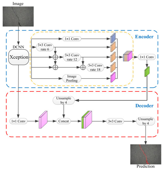 DeepLabv3+ is one of the best semantic segmentation algorithms currently. On the basis of DeepLabv3, this algorithm forms a coding-decoding structure by adding a concise and effective decoder. The overall network structure of DeepLabv3+ is shown in Figure 2.