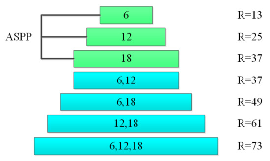 The original ASPP module works in parallel, and each branch does not share any information, while the improved module realizes information sharing through layer-jumping connection. The atrous convolution of different atrous rates depend on each other, which increases the range of receptive field. Using to denote the receptive field provided by the atrous convolution with atrous rate and convolution kernel size , and it is known from Equation (1) that the maximum receptive field of the original ASPP module is: