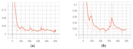 In Figure 8, the x-axis is the number of training iterations, and the y-axis is the network loss value. It can be seen from Figure 8 that due to the loading of the pre-trained model, the training loss value and validation loss curve can be reduced to a lower value in a few iterations. It also can be seen that the loss value maintains a downward trend until it finally converges. The training loss value drops to a relatively small value when the number of iterations is greater than 10,000. The overall effect of training is ideal.