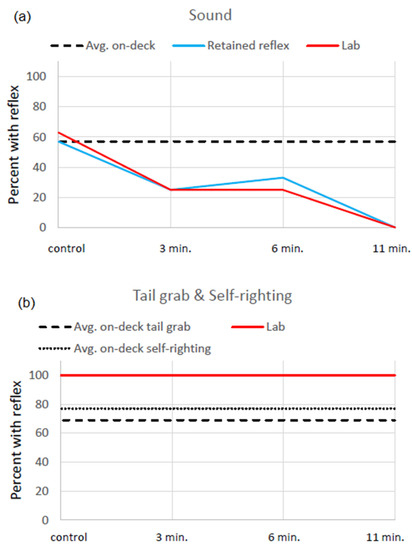 (a) Sound; (b) Tail grab and Self-righting. The percent of sablefish that successfully performed each reflex test, on-deck after capture on hook-and-line longline gear and in the laboratory (lab) after experimental treatments, where fish were exposed to air for 3, 6, or 11 min., or were in a control group. In the laboratory, fish were tested at least 42 days after capture, which was 7–10 days after controlled laboratory experiments. The total number of fish on-deck was 35 and in the laboratory it was 32; 3 were tested on-deck and then sacrificed. There were 8 fish in each treatment group in the laboratory. “Retained reflex” in the figure panel for “sound” is the percent of fish that had a sound reflex on-deck and retained it after laboratory experiments.