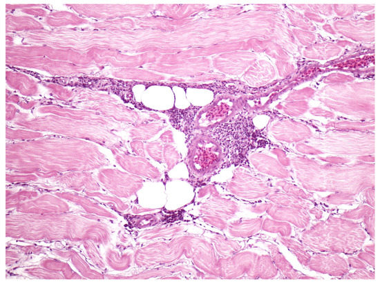 Skeletal muscle perivascular connective tissue moderately expanded by dense aggregates of mixed leukocytes; inflammation with no specific cause identified.