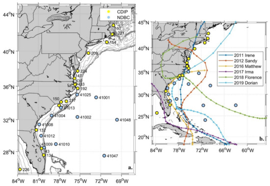 (a) Map of the Northern Atlantic Ocean showing CDIP and NDBC locations used in the study and (b) buoy location map overlaid with hurricane tracks assessed in this study.