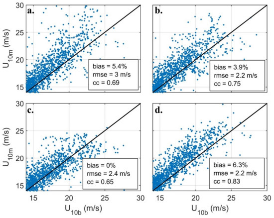 Buoy (U10b)-model (U10m) wind comparison plots for (a) NCEP, (b) IFREMER, (c) ECMWF and (d) WIS wave models for all six hurricanes. Error statistics for each model is provided in each figure.