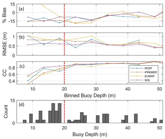 Buoy-model wave comparisons are expected to degrade towards the coast where topographic effects and shallow water physics become increasingly important. Additionally, modeled bathymetry is often too coarse to resolve features that influence wave transformation. As a result, these regions are more difficult to simulate or in some cases are not represented in the model (e.g., diffraction) [53]. To assess the bias variability in extreme wave heights (Hs > 3 m) as a function of depth, cumulative buoy error statistics were computed for binned depth ranges beginning at the shallowest buoy depth and extending to a depth of 50 m (Figure 4). The results showed a generally decreasing performance of models with shallowing depth, with substantial degradation of correlation near 20 m depth where the largest swell transitions to shallow water waves. The wave models have a cc around 0.9 at the 23.5 m depth bin that degrades to a range of 0.3–0.57 at the shallowest bin. Therefore, we used the 20 m depth as a demarcation of “shallow” and “deep” buoys. This threshold provided approximately 60 (shallow) and 150 (deep) total comparison buoys for the six hurricanes assessed in this study (Figure 4d).