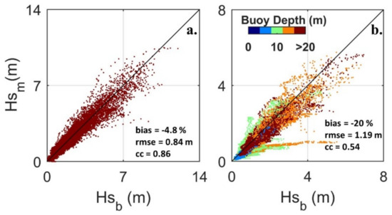 Comparison plots of buoy significant wave height (Hsb) to NCEP simulated significant wave heights (Hsm) for (a) buoy depths greater than 20 m and (b) less than 20 m. Error metrics were provided for each plot for Hs > 3 m.