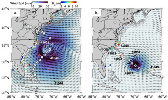 The NDBC operates the most extensive wave buoy network in the world with coverage offshore and along most of the U.S. coastline, including Alaska, Hawaii, and the Great Lakes [42]. For this work, we utilize the Atlantic Ocean network providing coverage for North American hurricanes. The NDBC buoy data typically includes hourly measurements of Hs, the 1D energy density spectrum and the cross-spectral moments a1, b1, a2, and b2. Observational buoy networks, such as the NDBC and the CDIP network, have been used for numerous studies, including the historical characterization of deep water and nearshore wave climates [43,44,45], observations within TCs [9,11,16], and prediction of rogue waves [46].