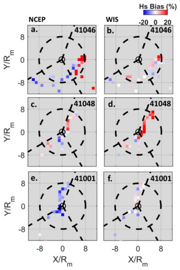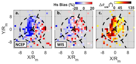 The most prominent pattern from these assessments was evident for the NCEP and WIS models that consistently overestimated Hs in the right sector and underestimated Hs in the left and back sectors (Figure 7a,b). NCEP comparisons exhibited larger underestimation in the left sector while more prominent overestimates were observed for WIS comparisons in the right sector. Specifically, the NCEP model had biases of −16.8%/4% (left/right sectors), compared to −3.8%/6.2% for the WIS model. The IFREMER results were similar, but the model overestimates in the right sector were confined to the upper right region of the storm (Figure S2). In comparison to the variability in Hs biases found in WW3 models, the WAM ECMWF model exhibited consistent underestimation of Hs in all sectors.