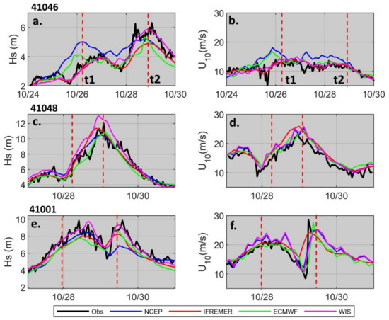 Comparisons at 41046 and 41048 provided examples of model Hs overestimation errors in the right sector of Hurricane Sandy. The NDBC buoy 41001 was used to provide a contrasting example of typical underestimation patterns observed at buoys located on the left side of the TC. It was a similar distance from the eye of Hurricane Sandy as 41048, but on the weaker left side of the storm (Figure 6a). WIS Hs outputs at 41001 compared well to observed wave heights (Figure 8e and Figure 10f). Conversely, NCEP outputs revealed a tendency of Hs underestimation, with a large underestimation of the wave energy after the storm track changed to its final NW direction generating a second Hs peak (Figure 8e, Figure 9f and Figure 10e). The NCEP Hs underestimation pattern observed in the left sector for 41001 was in contrast to an overestimation pattern evident at 41048, located in the right sector of the storm. Both IFREMER and ECMWF models also tended to underestimate both Hs peaks (Figure S3).