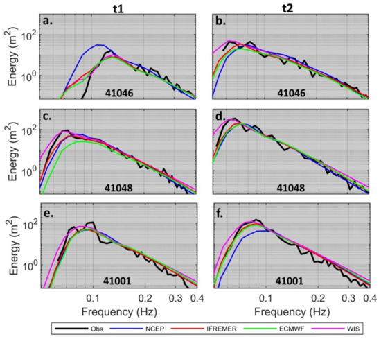 Buoy-model 1D wave spectra comparisons at (a,c,e) t1 and (b,d,f) t2 (see Figure 8) for buoys (a,b) 41046, (c,d) 41048, (e,f) 41001 during Hurricane Sandy.
