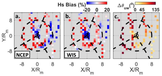 Hs bias at all buoy locations during Hurricane Sandy for (a) NCEP and (b) WIS in a storm-centric frame of reference with distance from the eye normalized by the radius of maximum winds (Rm). (c) Difference between dominant wave direction and wind direction (). Observations were binned into 1 Rm × 1 Rm bins. The inner circle denotes 1 Rm and outer dotted circle denotes 8 Rm. Direction of storm motion is up the page.