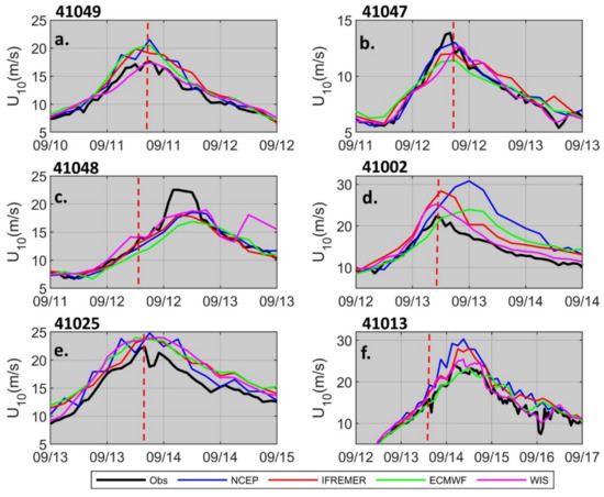 Buoy-model time-series comparisons of model wind input for buoys (a) 41049, (b) 41047, (c) 41048, (d) 41002, (e) 41025 and (f) 41013 during Hurricane Florence. The red dotted vertical line denotes the time used to assess the 1D wave spectra in Figure 14.