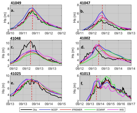 Buoy-model time-series comparisons of Hs for buoys (a) 41049, (b) 41047, (c) 41048, (d) 41002, (e) 41025 and (f) 41013 during Hurricane Florence. The red dotted vertical line denotes the time used to assess the 1D wave spectra in Figure 14.