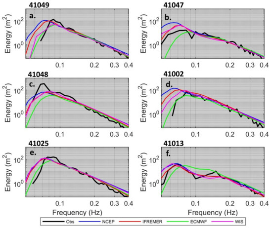 Model resolution was also a likely problem area, particularly for the high gradient regions generated by Hurricane Florence. For example, the wave models did not properly reproduce the wave spectra during periods of RI, with consistent overestimates of the low frequency portion of the spectra for NCEP and IFREMER models and underestimates of the spectral peak by ECMWF and WIS models (Figure 14a). The variability in error across the models show properly simulating wave growth during RI remains a challenge. In addition, the tendency of the models to underestimate/overestimate wave regimes on the right/left sides of Florence was similar to error patterns discussed by [32] generated from DIA parameterization errors. However, given the location of 41047 in the CS and near OS region of the hurricane (left, back sectors), another potential source of Hs model error was the wind-induced swell decay (negative wind input), which has been found to be too weak resulting in overestimation errors as discussed by [15]. Ref. [15] showed that enhancing the negative wind input properly can effectively improve model skill in these cases. The low frequency energy in the 1D wave spectra at 41047 contains less energy and looked flat compared to other buoys, consistent with the occurrence of higher swell decay that was not be simulated by the wave models (Figure 14b).