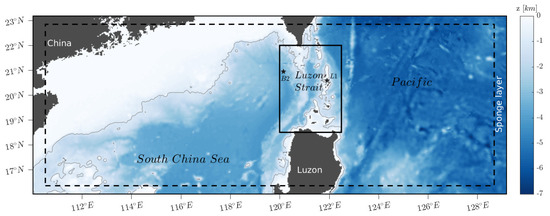 Internal waves for which reduced gravity provides the restoring force widely occur in seas and are responsible for enhanced dissipation in the deep ocean [1]. Most of the internal wave energy is radiated from the source over a long distance, which can significantly affect the space-time distribution of energy available for global mixing [2,3,4]. The South China Sea may have most intense internal waves among all oceans. Internal solitary waves with peak-to-trough amplitudes over 150 m have been reported in the northern South China Sea, and such waves are believed to impact other ocean processes notably [5,6]. Both observation and numerical simulation studies have suggested that the Luzon Strait is the main generation site of internal waves in the northern South China Sea [7,8,9,10,11,12,13,14]. Alford et al. depicted a cradle-to-grave picture of internal waves from the Luzon Strait to the continental shelf on a basin scale through the combination of in situ data and numerical simulation [15]. In situ observations show that the regularity and strength of internal solitary waves on the shelf of the northern South China Sea has a significant spring-neap variability [12,15,16]. Moreover, internal tides in the deep basin west of the Luzon Strait also show a spring-neap variability that has been demonstrated by moored current observations [17]. In addition, numerical simulations and remote sensing data suggest that internal solitary waves on the shelf are developed by nonlinear steepening and frequency dispersion of the baroclinic tides generated in the Luzon Strait by tide–topography interactions [8,9,12,15,18]. As Ramp et al. stated, “Most of the features of the wave arrival can be explained by the tidal variability in the Luzon Strait” [16]. Therefore, the generation of baroclinic tides in the Luzon Strait, which is investigated in the present study, is important for forecasting internal wave characteristics in the South China Sea.