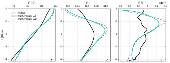 Figure 2. (a) The temperature, (b) salinity, and (c) buoyancy frequency profiles. Gray dashed lines are the initial field. Black and blue solid lines are the background profiles at L1 and B2, respectively.
