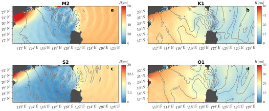 Figure 3. The co-tidal charts calculated from model-predicted sea-level height for (a) M 2 , (b) K 1 , (c) S 2 , and (d) O 1 . Patched colors represent amplitude, gray lines represent phase (in deg and in reference to 0 ).