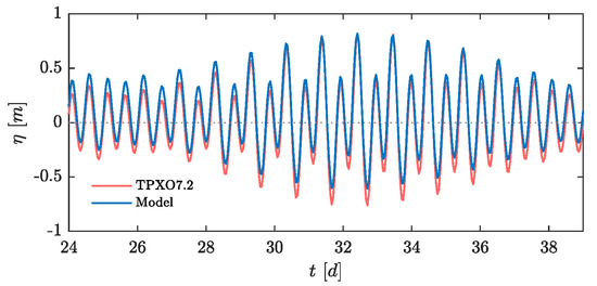 Figure 5 shows the comparison of time series of sea-level height η at L1 between our model prediction and TPXO7.2. L1 is located on the side of a seamount in the Luzon Strait and is hypothesized to be a generation source for internal waves [16]. These two time series are in good agreement, and both show well-recognized spring-neap characteristics. The heights of high tides and low tides are different, but the phases match very well. Therefore, our model is suitable for the simulation of tidal characteristics.