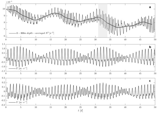 Figure 6. (a) The time series of 0–300-meter depth-averaged N 2 and corresponding time-smoothed result (bold line) at L1. The shaded bar represents a three-day period. (b) The zonal barotropic U and (c) V at L1.