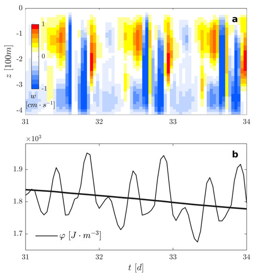 In the following, we introduce the potential energy anomaly φ = g H ( ρ ^ ρ ) z ¯ [39,40] to explain what happens during stratification changes, where g is the gravity acceleration and ρ ^ is the depth-averaged density. φ is a depth-integrated value that represents changes in potential energy relative to the vertically homogeneous conditions. For a given density profile, φ is the amount of work per unit volume required to completely homogenize the water column [40]. Thus, we define Δ φ = φ φ 0 as the potential energy anomaly change, where φ 0 is calculated from the initial field.