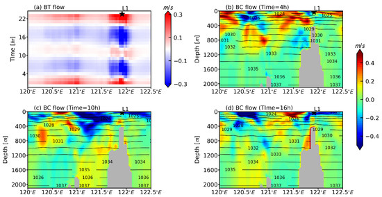 Figure 8. (a) The daily cycle of barotropic U-velocity in the zonal L1-section of day 25. The corresponding baroclinic U-velocity (shaded) and the isopycnals (contours) at (b) 4:00, (c) 10:00, and (d) 16:00.
