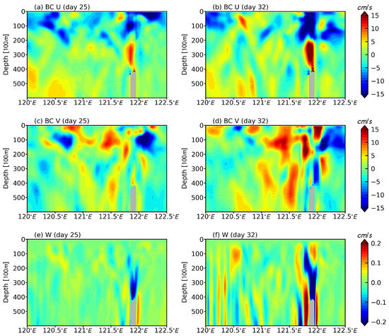 Figure 10. Daily averages of (a,b) baroclinic U-velocity, (c,d) baroclinic V-velocity, and (e,f) W-velocity in the zonal L1-section over the ascending part day 25 and the descending part day 32.