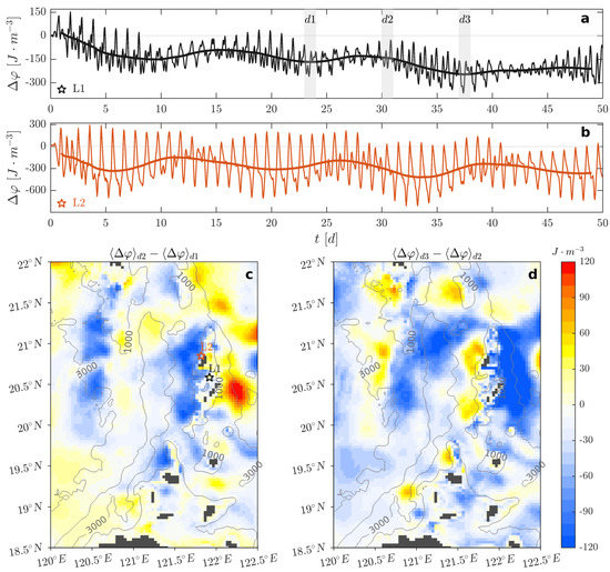 These dynamics can explain how the stratification process varies at L1. Subject to our model configuration, the energy that enhances the stratification must originally come from boundary forcing. Given that there are two ridges in the Luzon Strait, when the stratification at L1 is enhanced, the stratification at other places within the Luzon Strait should be weakened. Figure 11a,b shows Δ φ and the corresponding time-smoothed result at L1 and L2, respectively, where L1 is on the east side of the ridge and L2 is on the west side of the ridge. The time-smoothed result at L2 shows an almost inverse phase compared to that at L1, which proves our speculation. In order to determine the spatial distribution, we calculated three daily averages Δ φ that are separated by 6 days, d 1 , d 2 and d 3 (Figure 11a).