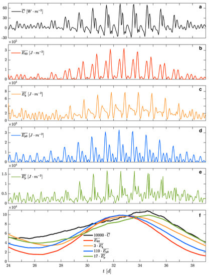 Figure 12. (a) Time series of depth-integrated barotropic to baroclinic conversion rate C ¯ , (b) barotropic kinetic energy E k 0 ¯ , (c) baroclinic kinetic energy E k ¯ , (d) barotropic potential energy E p 0 ¯ , and (e) baroclinic potential energy E p ¯ at L1. (f) Time-smoothed results of the above-mentioned components with the same color.
