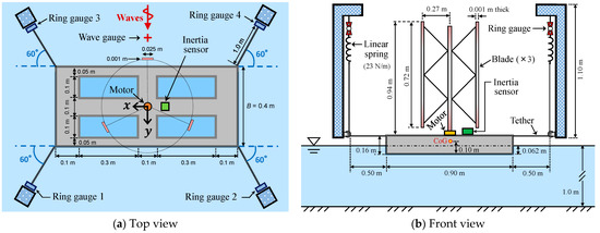 In our previous study [26], we presented a series of model tests conducted in the wave tank of Nihon University. A sketch of the experimental setup is shown in Figure 2, where a 2 MW vertical-axis wind turbine model in 1:100 scale was mounted on the center of a barge-type floating platform. The floating system was moored by four horizontal tethers to the linear springs connected with ring gauges. Four pulleys were used in the mooring system, where friction damping may have arisen and somewhat influenced the experimental results. This influence is difficult to eliminate in experimental measurements. The pre-tension of the springs was 2 N, and the spring stiffness was 23 N/m. The six degree-of-freedom motion responses of the floating system and associated mooring tether tensions were measured by the inertia sensor and ring gauges. The sample rate of the experimental data acquisition system was 100 Hz. FFT (Fast Fourier Transform) analysis was performed to obtain the zero-frequency component of mooring forces, and then mean drift forces were determined. No filtering treatment was conducted on the measured data. The main parameters of the floating foundation and wind turbine models can be found in Figure 3. The experimental variables are listed in Table 1, including the wave conditions and wind turbine conditions.