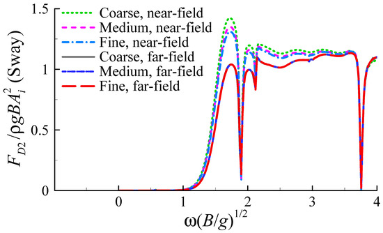 A mesh convergence test was carried out before numerical analysis. Three types of computational meshes with different resolutions were used for the freely floating barge-type FOWT foundation with four moonpools. The geometric parameters of the barge and moonpools can be found in Figure 3. The calculated mean sway drift forces are shown in Figure 4, where ρ is the density of water and g is the gravitational acceleration. For the coarse, medium and fine meshes, the parameter “panel_size” of WAMIT was set to be 0.1, 0.05 and 0.025 in the computations, respectively, corresponding to the total number of computational panels of 144, 468 and 1332. Both the far-field method and the near-field approach were considered for comparison.