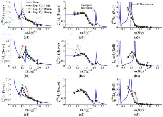 First-order motion responses of the vertical-axis floating wind turbine with four moonpools in beam waves. (a1–a3) Mb = 154 g and Ai = 0.01 m; (b1–b3) Mb = 44 g and Ai = 0.01 m; (c1–c3) Mb = 154 g and Ai = 0.02 m.