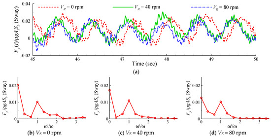 Figure 6 shows the time histories of the non-dimensional mooring force and the corresponding amplitude spectra from FFT analysis, where the three rotating speeds of VR = 0, 40 and 80 rpm are included, and Sb (=BL − 4 WmLm) is the area of the floating foundation surrounded by waterlines in the xy-plane. The period of incident waves in Figure 6 is T = 0.79 s (corresponding to ω(B/g)0.5 = 1.61). The mean sway drift force on the FWT model corresponds to half the amplitude at zero frequency of the response spectra. Figure 6 indicates that the mean sway drift force on the FWT model induced by beam waves could be even larger than the first-order wave force, and is therefore worthy of attention.