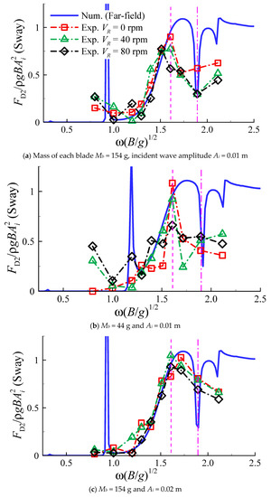 Figure 7 shows the experimental results of the mean sway drift force on the floating FWT model with four moonpools, where the WAMIT predictions using the far-field method are also included for comparison. Note that in the calculations, gyroscopic effects and viscous damping were not taken into account, and the mooring lines were considered as linear springs. Comparing Figure 7a,b, it can be seen that the numerical solutions were similar for Mb = 44 g and Mb = 154 g, since the variation in blade mass was fairly small compared with the total mass of the floating system. Figure 7 shows that the experimental and numerical results were generally in reasonable agreement, despite noticeable differences at some frequencies. The sharp spikes of numerical predictions are ascribed to the omission of viscous effects of motion responses on mean drift force.