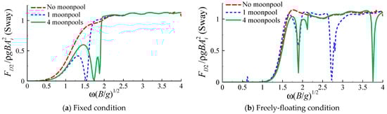 Numerical analysis was subsequently carried out based on WAMIT calculations. Attention was first paid to the effects of moonpool(s) on the mean sway drift forces of the barge-type platform in beam waves (β = 90°). Figure 8 shows the numerical results, where three types of platforms were considered, including the barge-type foundation alone (See Figure 3 for its geometric parameters), the barge with a large single moonpool (area: 0.6 m × 0.2 m) and that with four small moonpools (area: 0.3 m × 0.1 m). Regarding the fixed-structure condition, Figure 8a demonstrates that the mean sway drift force could be substantially reduced by the application of moonpool(s) for the frequencies within approximately 1.3 < ω(B/g)0.5 < 2.0 (corresponding to the wave period range of 6.3–9.8 s in full scale). Compared with the one-moonpool case, the four-moonpool case corresponded to a wider frequency range of reduction in mean drift force. As for the free-floating condition, Figure 8b shows that the sway drift force was reduced by (water motions in the) moonpool(s) at some typical frequencies. Nevertheless, compared with the fixed condition, this reduction effect was not so pronounced, since the frequency range of the reduction in drift force was relatively narrow. Taking the four-moonpool case as an example, the sway drift force was seen to approach response troughs at ω(B/g)0.5 = 1.90 and ω(B/g)0.5 = 3.75, which correspond to the piston mode and sloshing mode fluid resonances in the moonpools, respectively. In general, Figure 8 indicates that the application of moonpools could be useful in reducing horizontal mean wave drift force.