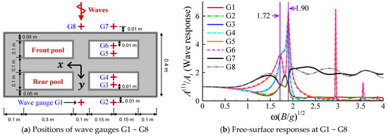 To understand the physical mechanism of the moonpool’s effects on mean sway drift force, the wave responses near the barge and inside the moonpools were examined. For simplicity of analysis, a fixed barge with four moonpools in waves was used as the example, corresponding to the case in Figure 8a. Figure 9a shows a sketch of the positions of the numerical wave gauges; Figure 9b presents the calculated first-order free-surface responses at these positions. It can be seen that the wave responses at G3 and G4 were almost identical, as were those at G5 and G6. The water motion at G1 and G2 was similar, as well as that at G7 and G8 despite small differences at high frequencies. Regarding the water oscillations in moonpools, the two response peaks at ω(B/g)0.5 = 1.72 and ω(B/g)0.5 = 1.90 correspond to the first- and second-mode piston-type resonances (symmetric problem, the front and rear pools leading to two resonant modes and frequencies), respectively, whereas the sharp spikes at ω(B/g)0.5 = 2.95, 3.55 and 3.88 (corresponding wavelength: 0.29 m, 0.20 m and 0.17 m) were confirmed to be sloshing-mode resonances in moonpools. The observed two resonant frequencies in Figure 9b are consistent with the typical frequencies at which the mean sway drift force was much reduced as shown in Figure 8a, suggesting that the reduction in mean sway drift force was due to resonant water motions in the moonpools.