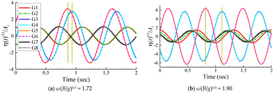 Furthermore, to explore the reason why the water resonance in moonpools could reduce horizontal mean drift force, the time histories of the wave responses at G1 ~ G8 were plotted based on the first-order frequency-domain solutions, as shown in Figure 10. Water motions at G1, G3, G5 and G7 were found to be almost in phase with their counterparts at G2, G4, G6 and G8, respectively. The oscillating amplitudes in the front and rear moonpools (defined in Figure 9a) were similarly much larger than those outside the moonpools. The water oscillations in the front and rear moonpools were close to in-phase motions at ω(B/g)0.5 = 1.72, and were close to anti-phase motions at ω(B/g)0.5 = 1.90. As for wave motion outside the moonpools, the most important finding from Figure 10 is that the wave run-up amplitudes at the windward and leeward sides of the barge were very close at the resonant frequencies, particularly at ω(B/g)0.5 = 1.72 (resonant frequency of the first mode). This result well explains the highly reduced mean sway drift forces at resonance shown in Figure 8a, where the mean sway drift force at ω(B/g)0.5 = 1.72 was observed to be almost zero. From a physical point of view, the phenomenon of similar run-ups at the wave incidence and transmission sides of the barge can be attributed to the significant radiation effect of moonpool resonance dominating the wave diffraction effect.