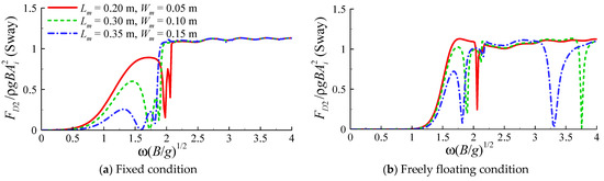 Considering the four-moonpool situation, Figure 11 shows the influence of the size of moonpools on the mean sway drift force, where Lm and Wm represent the length and width of each moonpool, respectively. Regarding the three cases in the figure, the corresponding ratio of the area of moonpools to that of the floating platform was 11.1%, 33.3% (present experimental setup) and 58.3%, respectively. Regarding the fixed condition, Figure 11a shows that the frequency range of reduction of mean drift force widened as moonpool area increased. For the case with Lm = 0.35 m and Wm = 0.15 m, the mean sway drift force was significantly reduced for ω(B/g)0.5 ≤ 1.8 (corresponding to T ≤ 7 s in full scale). For the free-floating condition, the reduction in frequency range also widened as the moonpools were enlarged, as shown in Figure 11b. Generally speaking, Figure 11 demonstrates that the observed reduction effect in mean drift force became stronger as moonpool area increased. Hence, we believe that favourable performance of the floating platform in respect to mean drift force could be achieved through geometric optimization.
