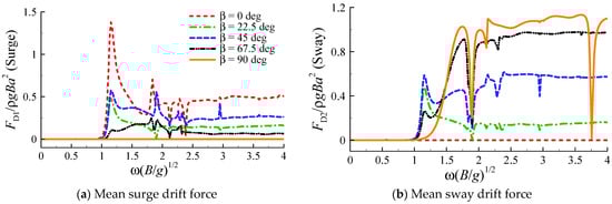 Subsequently, the effects of wave heading on the surge and sway mean drift force were examined, as shown in Figure 13. It can be seen that, as the wave angle was increased from β = 0° to β = 90°, the surge drift force reduced gradually to zero, whereas the sway drift force increased substantially at a wide frequency range. At quartering sea condition (β = 45°), Figure 13 demonstrates the coupling response characteristics of surge and sway mean drift forces.