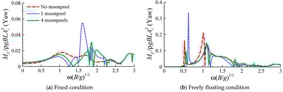 Figure 14 shows the calculated mean yaw drift moments on the barge with and without moonpool(s) at quartering waves (β = 45°). Regarding the fixed-floater condition, Figure 14a shows that the response peaks of mean yaw drift moment arose at certain frequencies with the application of moonpool(s). This result suggests that the mean drift yaw moment of the barge platform may be amplified by the water oscillations in moonpools. As for the free-floating condition, Figure 14b shows that the key frequencies corresponding to the large response peaks of the yaw drift moment shifted slightly as moonpool(s) were added. The maximum response value of mean yaw drift moment was influenced by water oscillations in the moonpool(s).