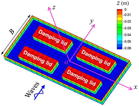 The numerical calculations of this study were carried out using the panel code WAMIT (Version 7.4), which solves wave radiation-diffraction problems in the frequency domain. A sketch of the calculation model and the definition of the coordinate system are illustrated in Figure 2. The origin o of the coordinate system was at the center of the barge-type floating platform on the still water level. The floater included four small rectangular moonpools (length is Lm and width is Wm) or one large moonpool (length is 2 Lm and width is 2 Wm). Regular waves were considered with the incidence angle defined as β.
