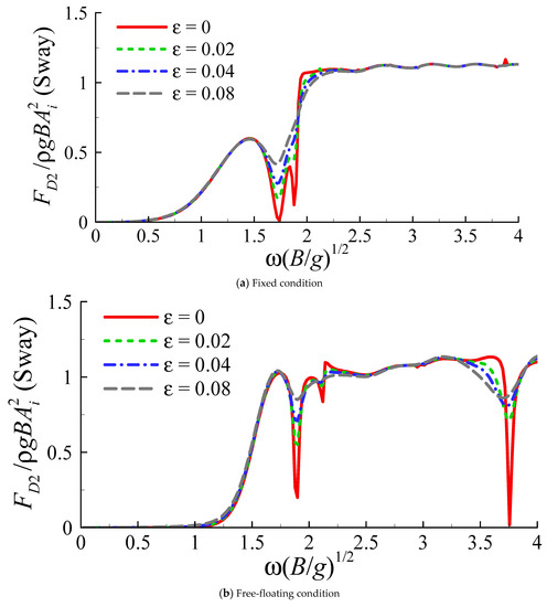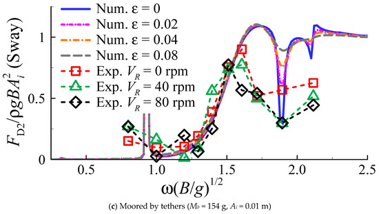 In our previous study [51], it was shown that the introduction of free-surface damping reduced the first-order water resonance in moonpools and associated heave motion of the floater. In this study, four values of ε (including ε = 0, corresponding to no viscous damping) were used in the computations and the results of the predicted mean sway drift forces using the far-field method are shown in Figure 16. Regarding the fixed condition, Figure 16a shows that the reduction effects of the moonpools in mean sway drift force at the resonant frequencies (ω(B/g)0.5 = 1.72 and 1.90) gradually weakened with the increasing damping coefficient ε. As for the free-floating condition, a similar result can be observed in Figure 16b, where the amplitudes of the sharp spikes at the natural frequencies (ω(B/g)0.5 = 1.90, piston mode; ω(B/g)0.5 = 3.76, sloshing mode) were reduced with increasing ε. Figure 16c shows the variation of calculated mean drift force with ε under the experimental condition (moored by tethers). The result is similar to the calculation results of [52,53]. Indeed, the near-field method was also confirmed to lead to similar damping effects, though the results are not shown here. Generally speaking, Figure 16 indicates that the previously observed reduction effects of moonpool(s) on mean sway drift forces at key frequencies will be weakened if the viscous damping of the water oscillations in moonpools is considered.