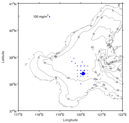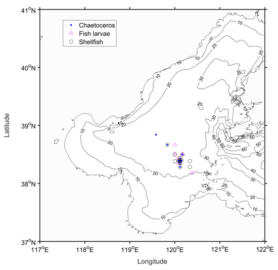 The Chaetoceros, fish larvae and shellfish distribution data near the Penglai 19-3 drilling field (120°06′ E, 38°23′ N) during 15 June–13 July was provided by the North China Sea Environmental Monitoring Center. The sampling and counting methods of Chaetoceros are vertical trawling sampling and the concentration counting method (The specification for marine monitoring-Part 7: Ecological survey for offshore pollution and biological monitoring (GB 17378.7-2007)). The sampling and counting method of fish larvae are trawling sampling and direct counting method (Specifications for oceanographic survey Part 6: Marine biological survey (GB/T 12763.6-2007)). Shellfish was sampled by a bottom sampler and counted by direct counting method (The specification for marine monitoring-Part 7: Ecological survey for offshore pollution and biological monitoring (GB 17378.7-2007)). The sampling stations located in the area with the depth more than 20 m, and the biomass of three organisms were little affected by the tidal movements. The distribution of sampling stations is shown in Figure 1 and the locations of observations is given in Table 1. The oil spill was detected on 17 June 2011, while Chaetoceros and shellfish were observed before and after the oil spill.