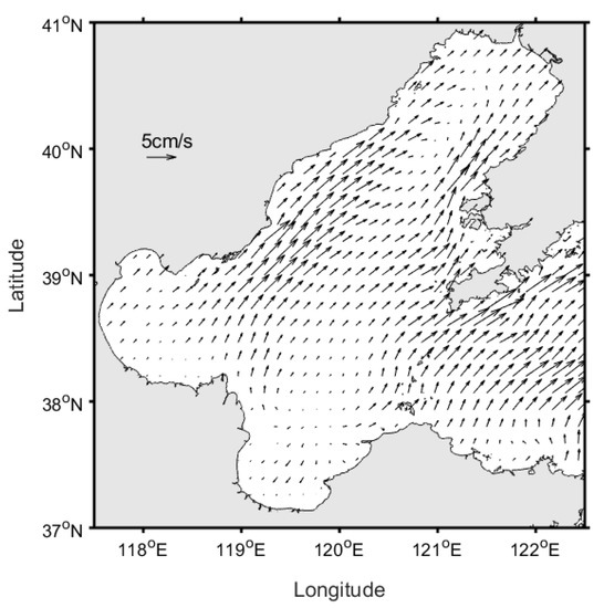 The flow field (Figure 3) which forces the oil transport model is calculated with the Finite-Volume Coastal Ocean Model (FVCOM). The computational domain is the Bohai Sea (117.5° E~122.5° E, 37° N~41° N), and the horizontal resolution is 1/24° in both latitude and longitude. The parameters of temperature and salinity are kept consistent with Chen et al. [49].