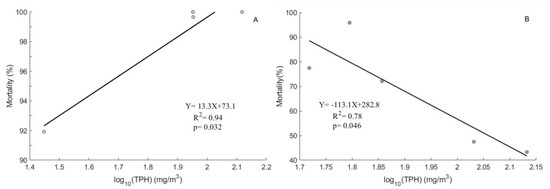 Relationship between the TPH and the Mortality of fish larvae (A), shellfish (B). The concentration of TPH is reduced by natural logarithm.