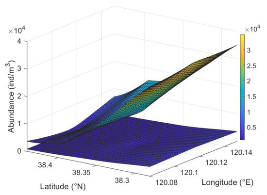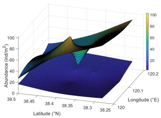 In order to analyze the effects of the oil spill on the distribution of organisms, the scatted observation data of Chaetoceros, shellfish and TPH is interpolated, with the the grid spacing of 10″ × 10″. Some interpolation methods, such as the Kriging, Cressman and RBF interpolations, have been proposed to alleviate this issue. Based on various interpolation methods, comparatively accurate and sufficient data are obtained in the field of marine science [44]. The interpolation method in this study is RBF interpolation, which is a well-established tool with high accuracy and numerical stability [45,46,47].