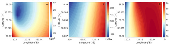 Distribution of the interpolated TPH concentration (A), death rate (B) and mortality (C) of Shellfish on 18 June.